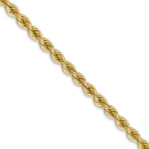 A traditional 14k yellow gold rope chain measuring 4mm in width is handmade and closes with a lobster claw clasp. Its versatile, solid link design is ideal for men and women. 26 inches in length.
