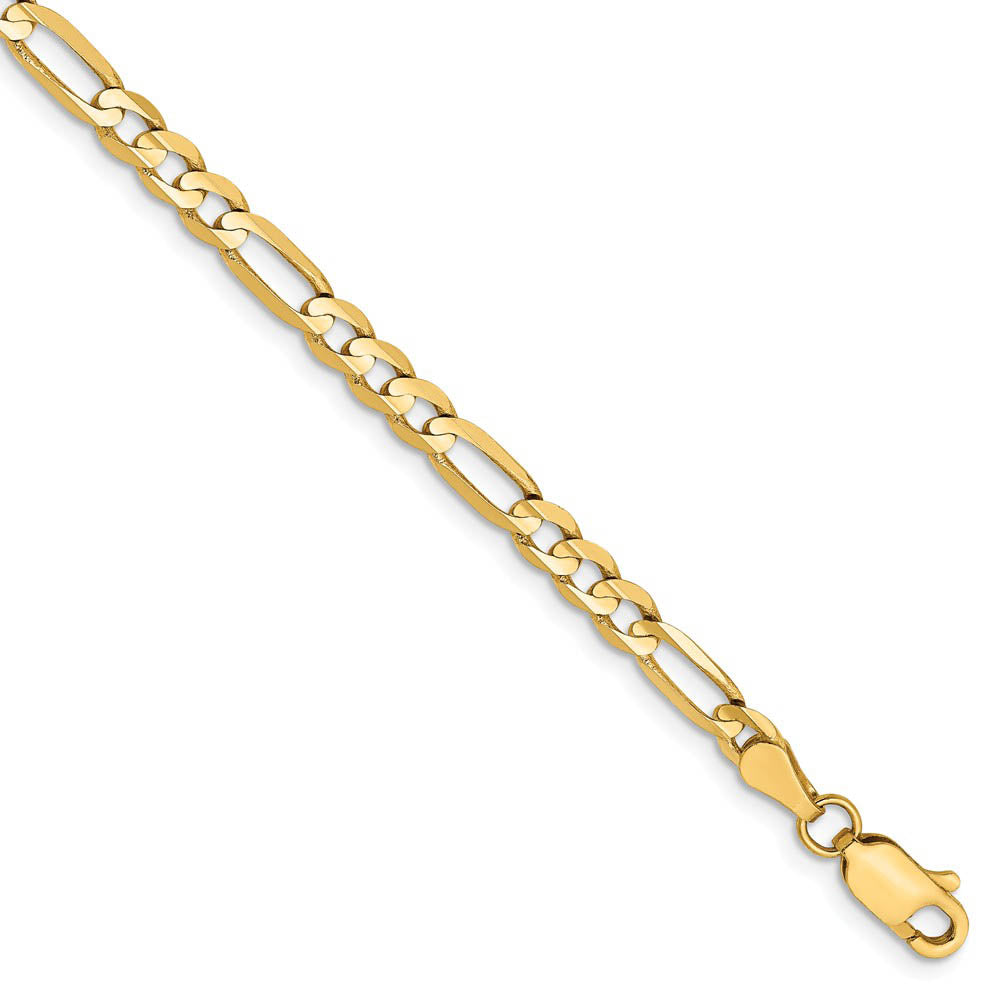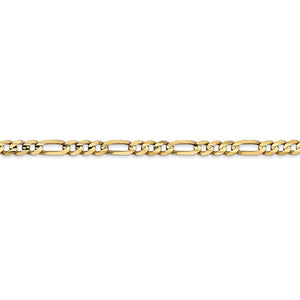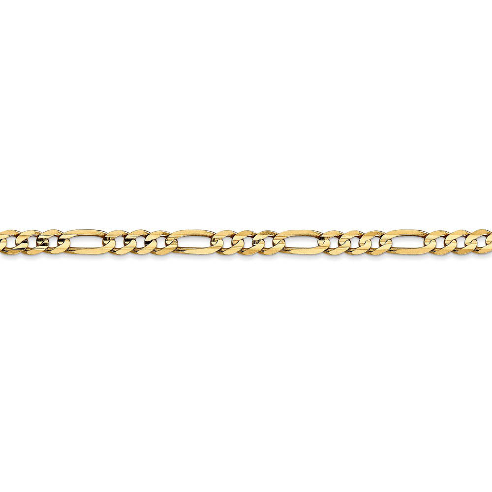 Our 14k yellow gold, open figaro chain closes with a lobster-claw clasp and features a modern concave design that has been hand-polished to ensure a smooth finish. Measuring 4mm in width, the solid link construction of this beautiful chain offers versatility along with durability. 7 inches in length.