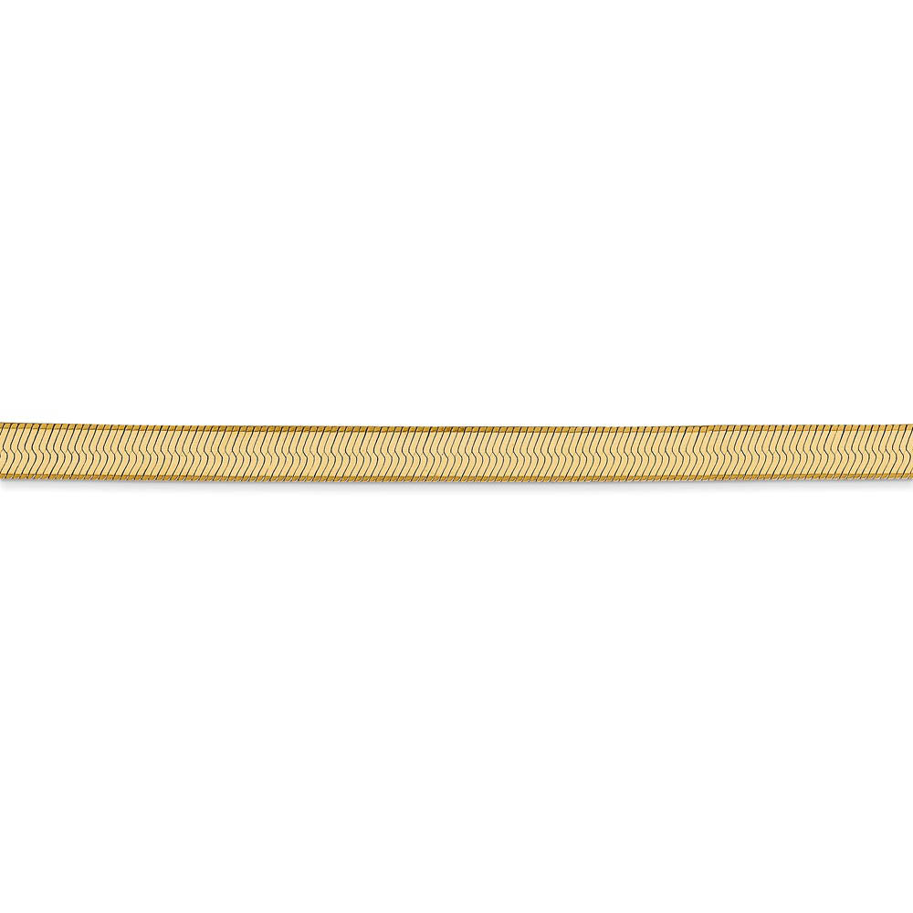 Express your bold attitude with a silky smooth chain that offers timeless appeal! This stunning 14k yellow gold chain features a classic herringbone pattern that measures 4mm in width and fastens with a secure, lobster-claw clasp. 7 inches in length.