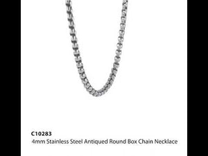 Simplicity and glamour come together as one in this sleek, round box chain fashioned from stainless steel, a contemporary metal that will not rust or tarnish. This antiqued necklace measures approximately 4mm in width by 20-inches in length and closes with a fancy lobster clasp.