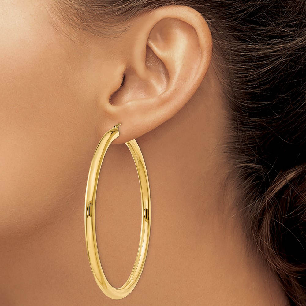 Simple and classic, our polished 14k yellow gold round hoops feature a hinged post and a hollow tube design that measures 4mm thick by 65mm (2 1/2 inch) in diameter.