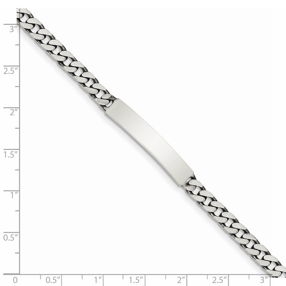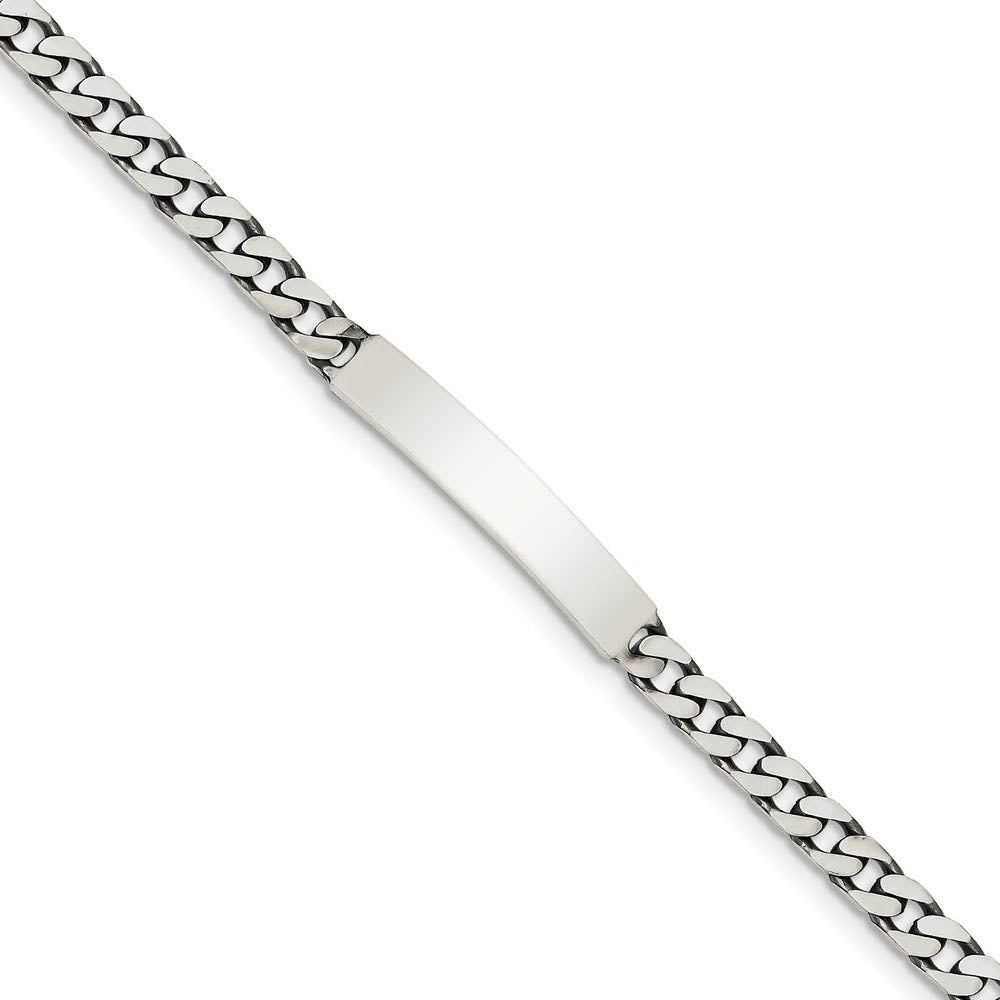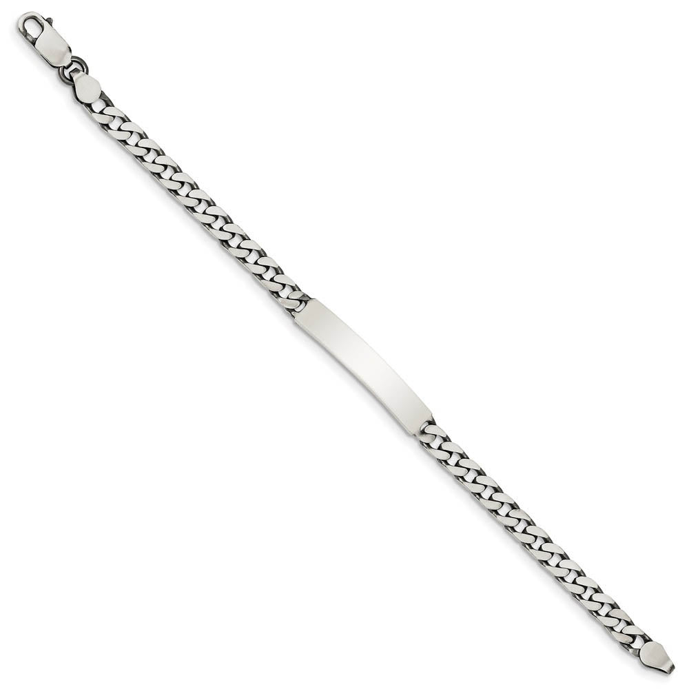 Identify yourself, remember a special person or even display a special message with this antiqued 7-inch women's ID bracelet. It is crafted from solid sterling silver and features a 32mm long x 5mm width ID plate. It is, of course, suitable for engraving. The 5mm width curb chain secures with a lobster claw clasp.