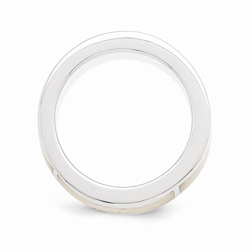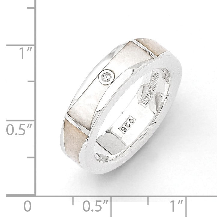 A timeless classic design featuring a single white diamond and mother of pearl set in a tarnish resistant, rhodium plated sterling silver band. This standard fit ring is 5mm in width and the natural 1-point diamond is I2 in clarity and H-I in color. Available in whole sizes 6-8 only and is not suitable for resizing or engraving.