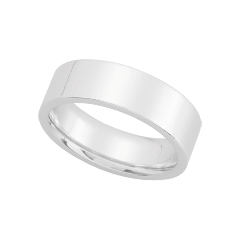 Sleek and simple with a contemporary flat profile designed from 14k white gold with a mirror polished finish. This 6mm band also features a comfort fit or rounded interior edges so it will not cut into your finger and is suitable for engraving.