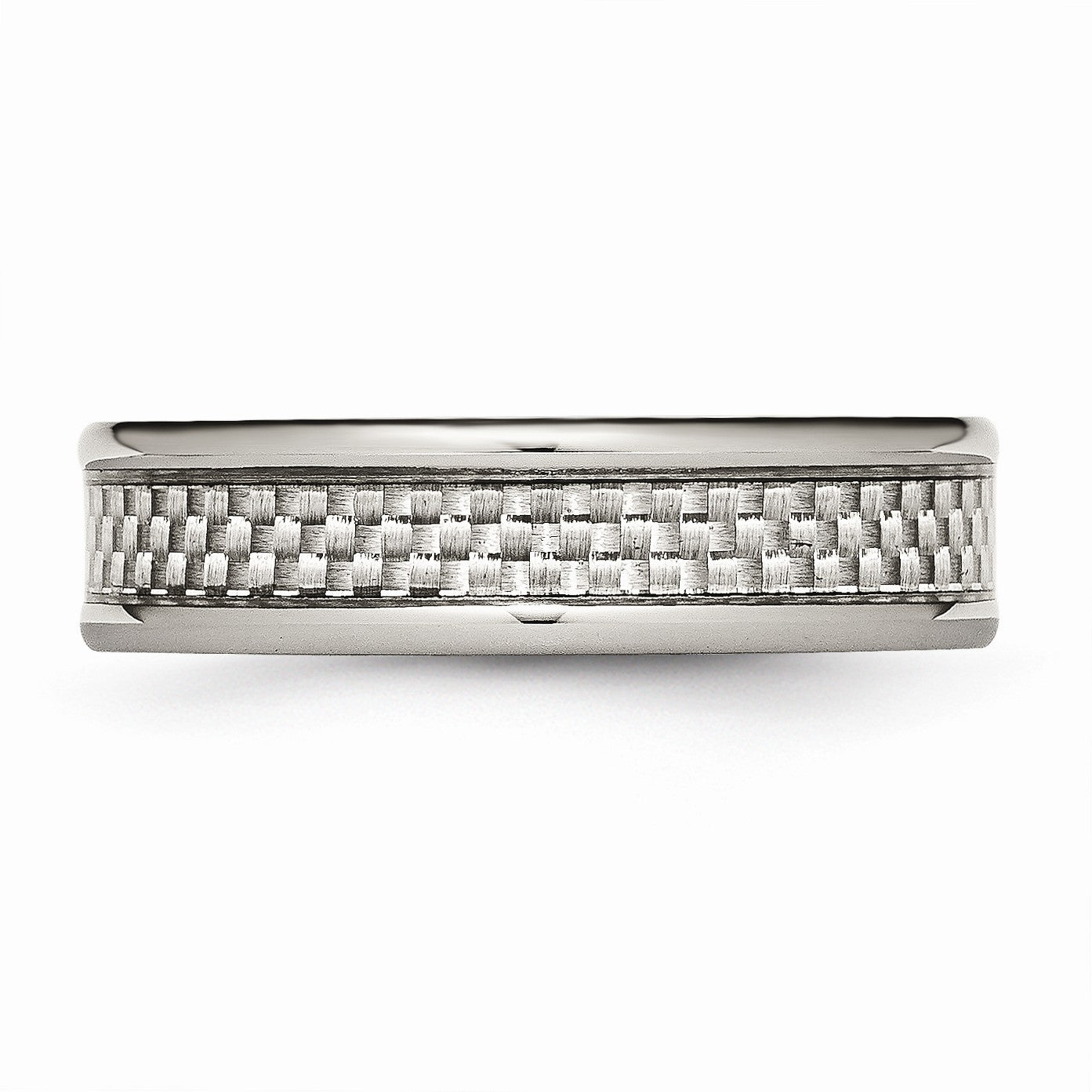 • A trendy modern design featuring a recessed center inlaid with gray carbon fiber and a rounded edge created from durable titanium. This unique band is 6mm in width, finished with a comfort fit interior and is suitable for engraving.