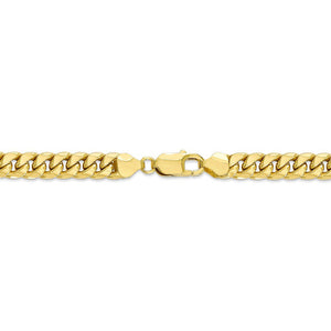 • Ageless and classic, a wide Miami Cuban curb chain is eye-catching and fashionable. The 10k yellow gold hollow links on this polished bracelet chain are 7.3mm in width by 8 inches in length and close with a sturdy lobster clasp.