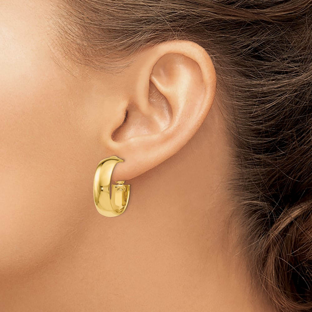 Simplicity offers versatility and timeless appeal. This oval hoop is designed from 14k yellow gold with a polished hollow tubing that is approximately 7.5mm (5/16 inch) thick, 19mm (3/4 inch) in width by 23mm (15/16 inch) in length. Made in Italy.