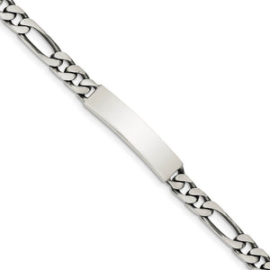 Identify yourself, remember a special person or even display a special message with this antiqued 8-inch unisex ID bracelet. It is crafted from solid sterling silver and features a 34mm long x 7mm width ID plate. It is, of course, suitable for engraving. The 7mm width figaro chain secures with a lobster claw clasp.