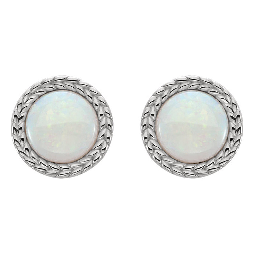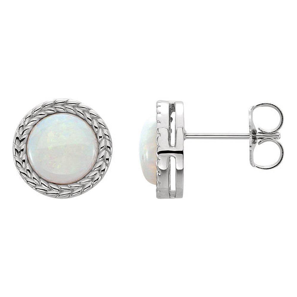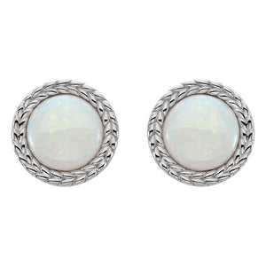 Simple elegance perfect for all ages, a 7mm genuine white opal cabochon set in 14k white gold with a friction-back post. The shifting hues and flashing fire seen in Opals are symbolic of love, life, hope and truth. Its rainbow of color also has year-round appeal, particularly among those who seek drama and harmonic balance. Color range varies on all natural stones so please allow for slight variations in shades. The total gemstone weight for the pair is 1.42 carats. Gemstone treatment: Natural, not enhanced. Approximate earring size 9.5mm (3/8 inch).