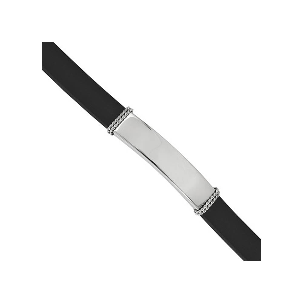 Identify yourself, remember a special person or even display a special message with this 8-inch long black rubber and stainless steel ID bracelet. It features a 9mm (3/8 inch) wide by 40mm (1 1/2 inch) long polished ID plaque that is, of course, suitable for engraving. It secures with a fancy lobster clasp.