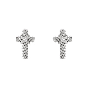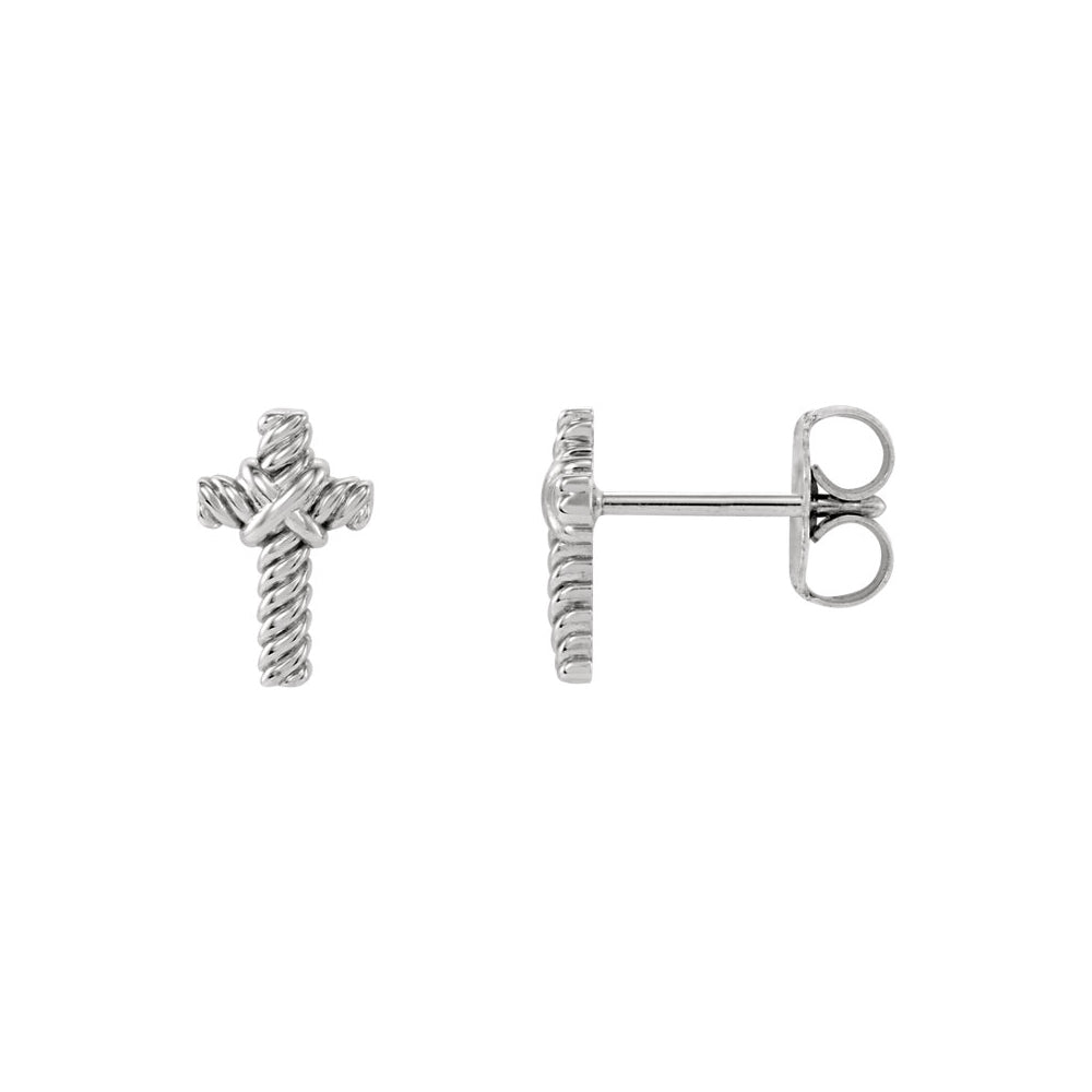 These small stud earrings feature a decorative Rope Cross designed from polished 14k white gold with a friction back post. It is approximately 6mm (1/4 inch) in width by 9mm (3/8 inch) in length.