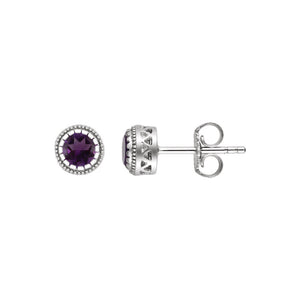 Amethyst is the gem most often used to celebrate those born in February as well as those born under the sign of Sagittarius. This unique stud features a faceted 4mm genuine amethyst with a bead detail border and a friction back post. The approximate diameter is 8mm (5/16 inch) and the total gemstone weight for the pair is 0.48 of a carat. The color range varies on all natural stones so please allow for slight variations in shades. Gemstone treatment: heat enhanced.