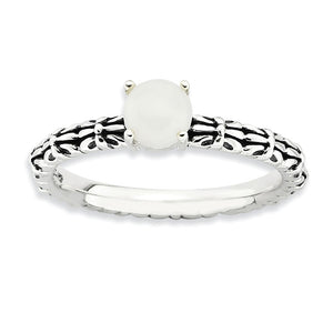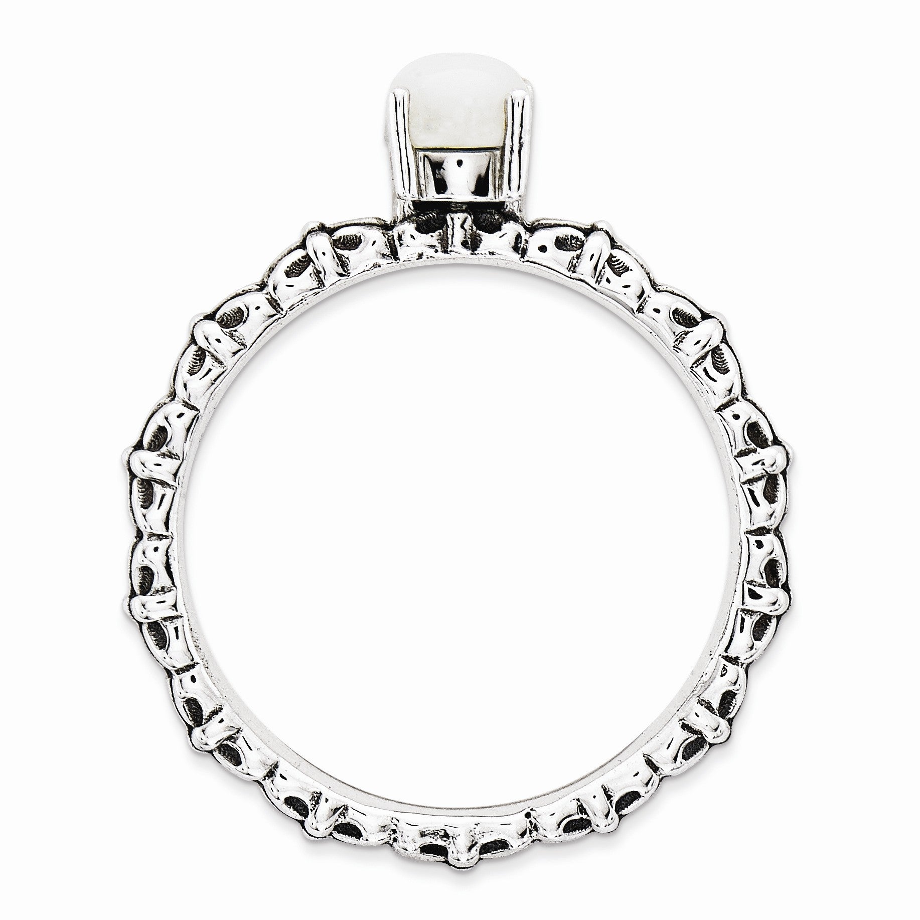 Rich in detail and exotic appeal! Featured atop a 2. Mm antiqued sterling silver band finished with an ornate design is a prong set white agate cabochon. Wear it alone as a solitaire or featured in a stacked collection. Guaranteed to fit together perfectly with all of the mix and match Stackable Expressions rings.