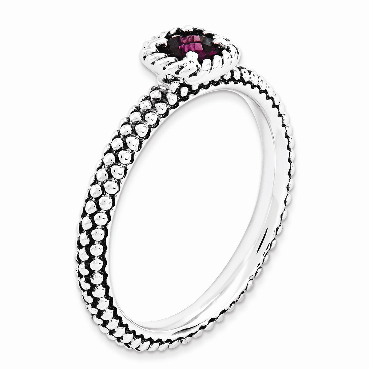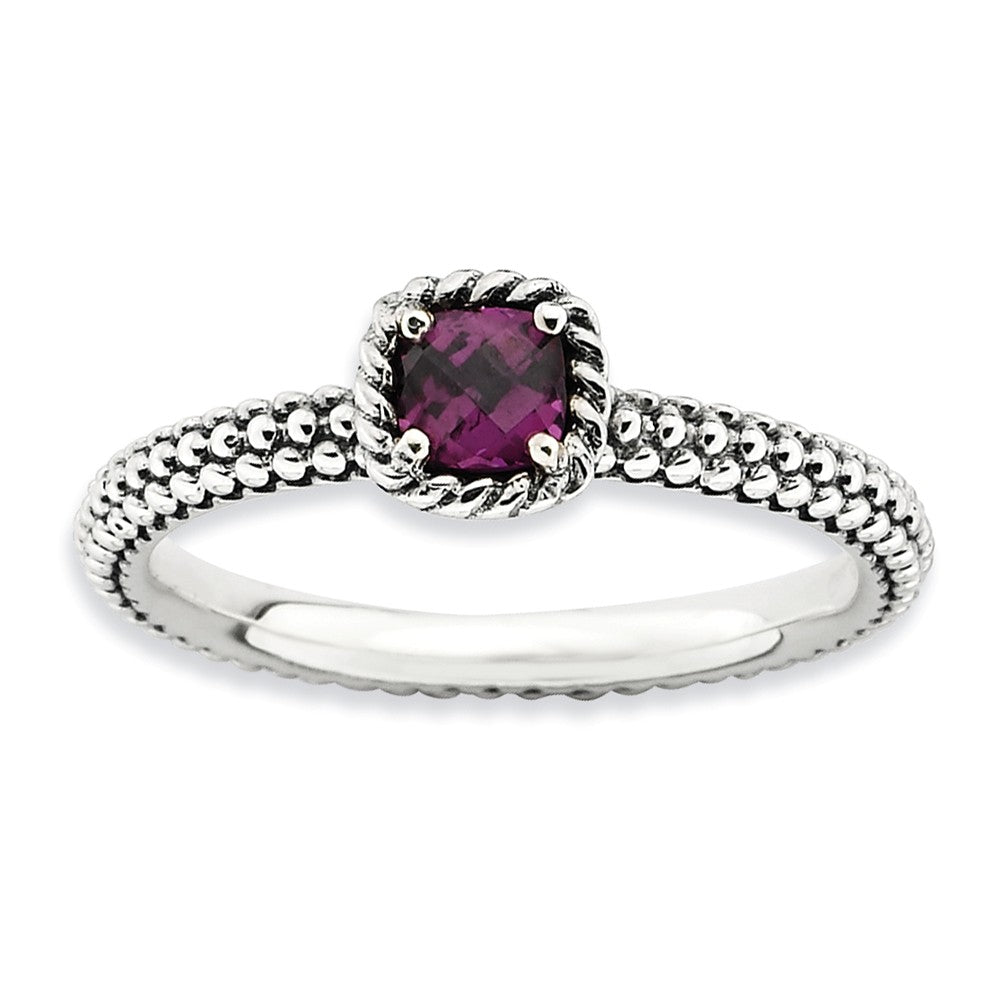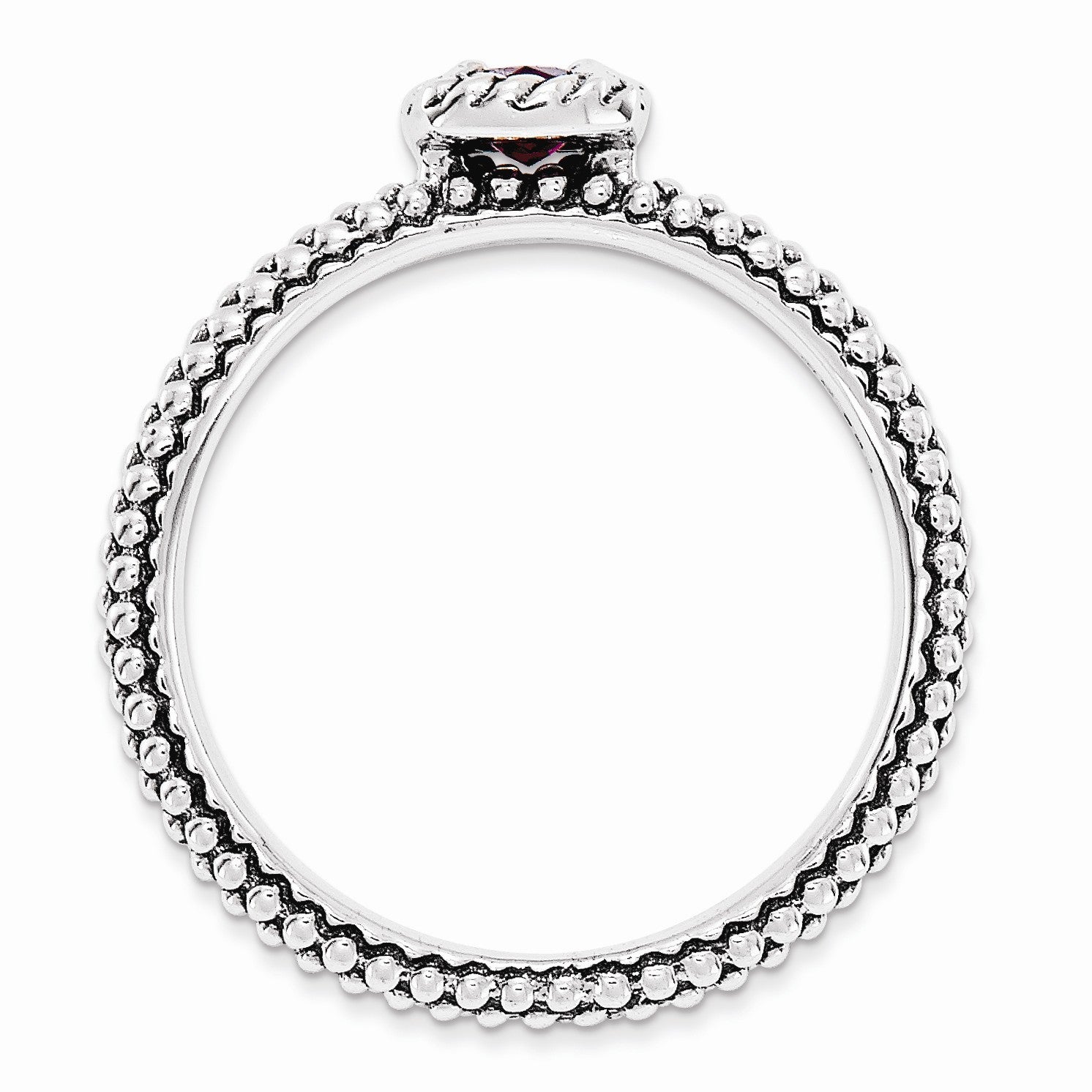 Featured atop a 2. Mm antiqued sterling silver band finished with milgrain detailing is a 4mm checkerboard cut rhodolite garnet prong set in a 6mm square rope mounting. Wear it alone or featured in a collection. Guaranteed to fit together perfectly with all of the mix and match Stackable Expressions rings.