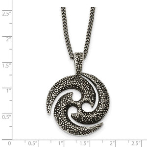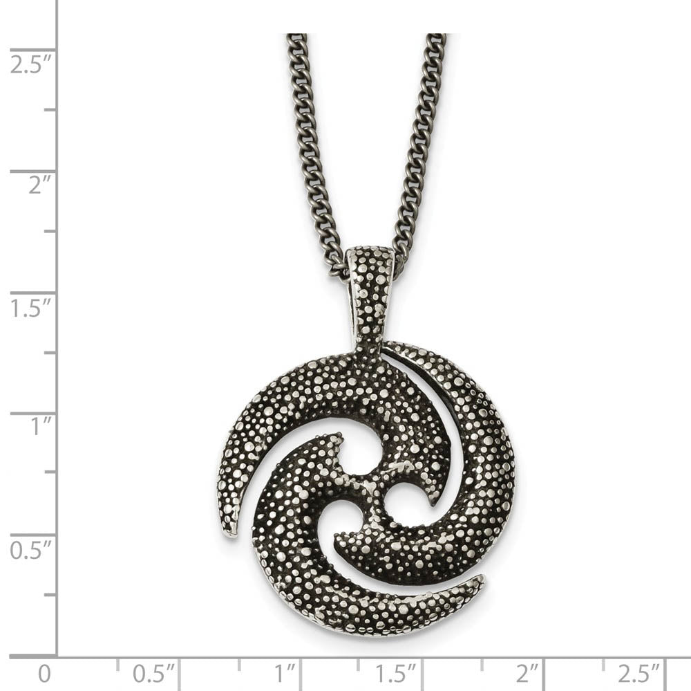 Bold, edgy and urban! Change up your look with this antiqued stainless steel necklace featuring a textured indigenous circle design. The pendant measures approximately 31mm (1 1/4 inch) in width by 40mm (1 1/2 inch) in length, which includes the bail. The curb chain is 2mm in width, 22 inches in length and closes with a fancy lobster clasp.