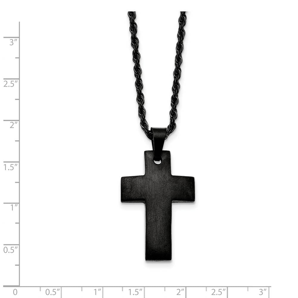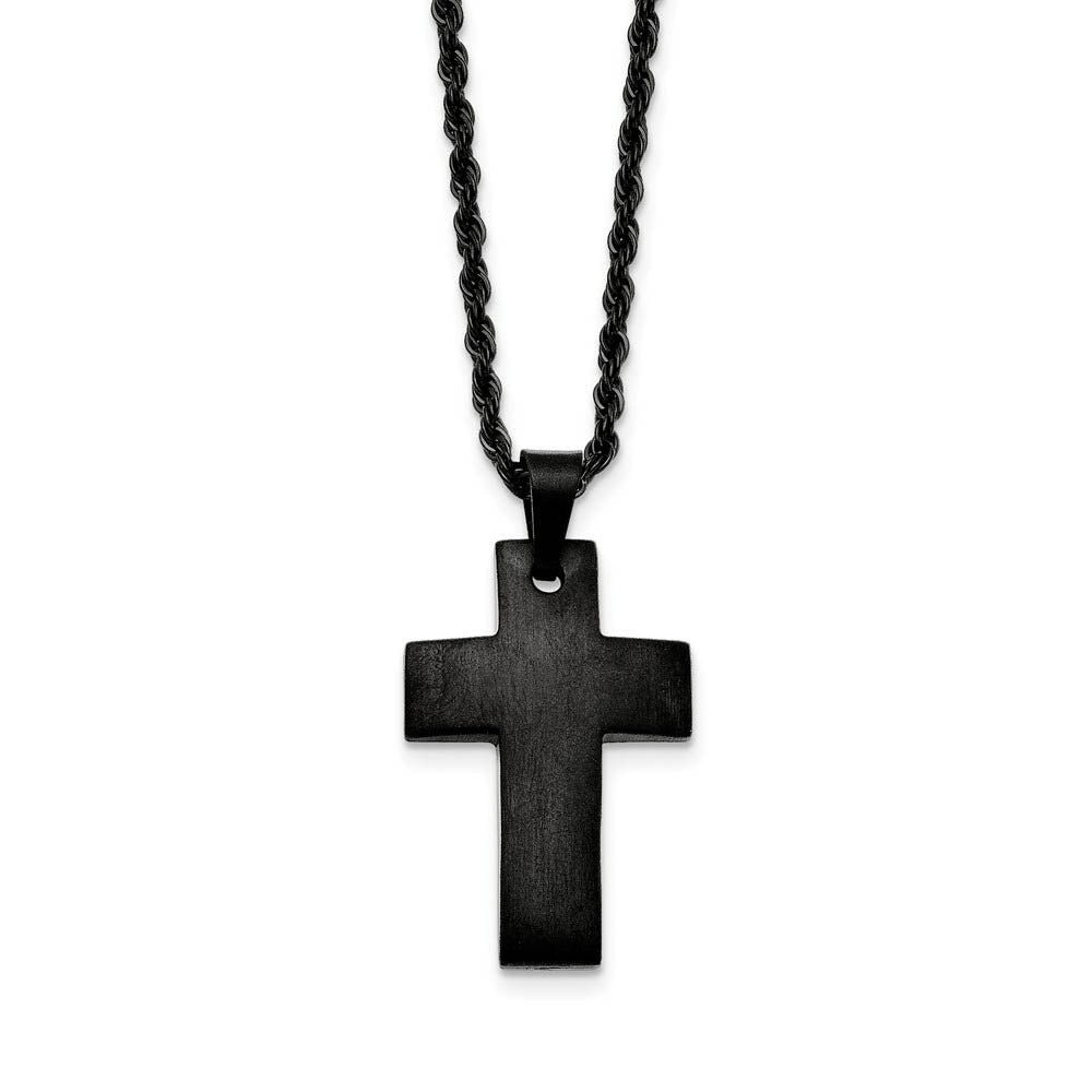 A timeless classic design fashioned from black-plated stainless steel featuring a brushed cross and rope chain necklace. The pendant is approximately 22mm (7/8 inch) in width by 40mm (1 1/2 inch) in length, which includes the bail. The rope chain is approximately 2.5mm in width by 20 inches in length and closes with a fancy lobster clasp.