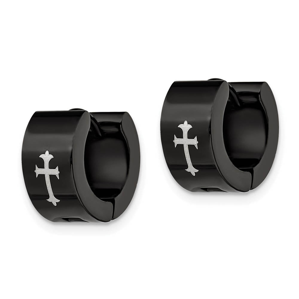 Prominently displayed on the front side of this black-plated stainless steel earring is a gray fleur-de-lis cross. Equally suitable for both men and women, this huggie style hoop featuring a hinged design with a notched post is approximately 7mm (1/4 inch) in width by 13mm (9/16 inch) in diameter.