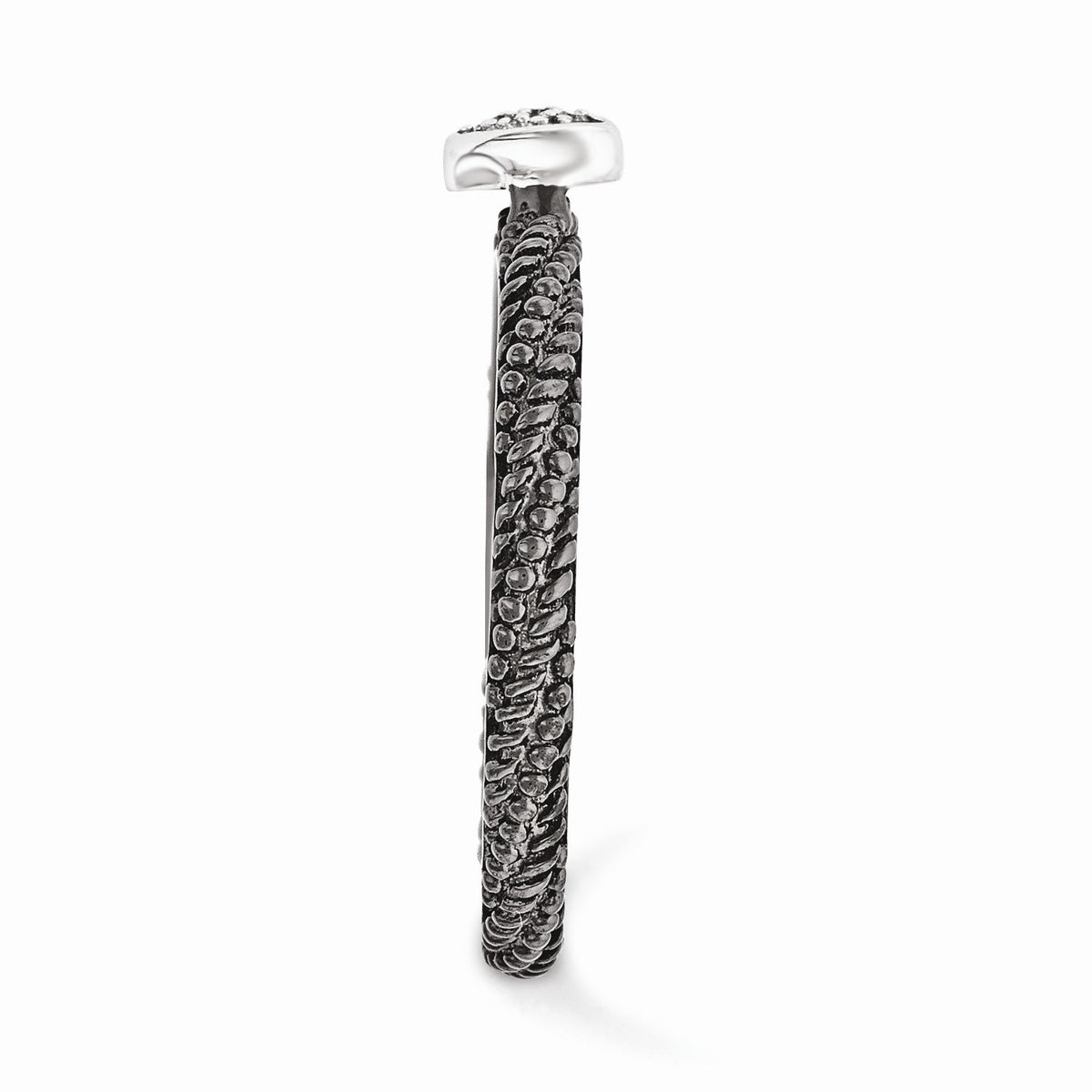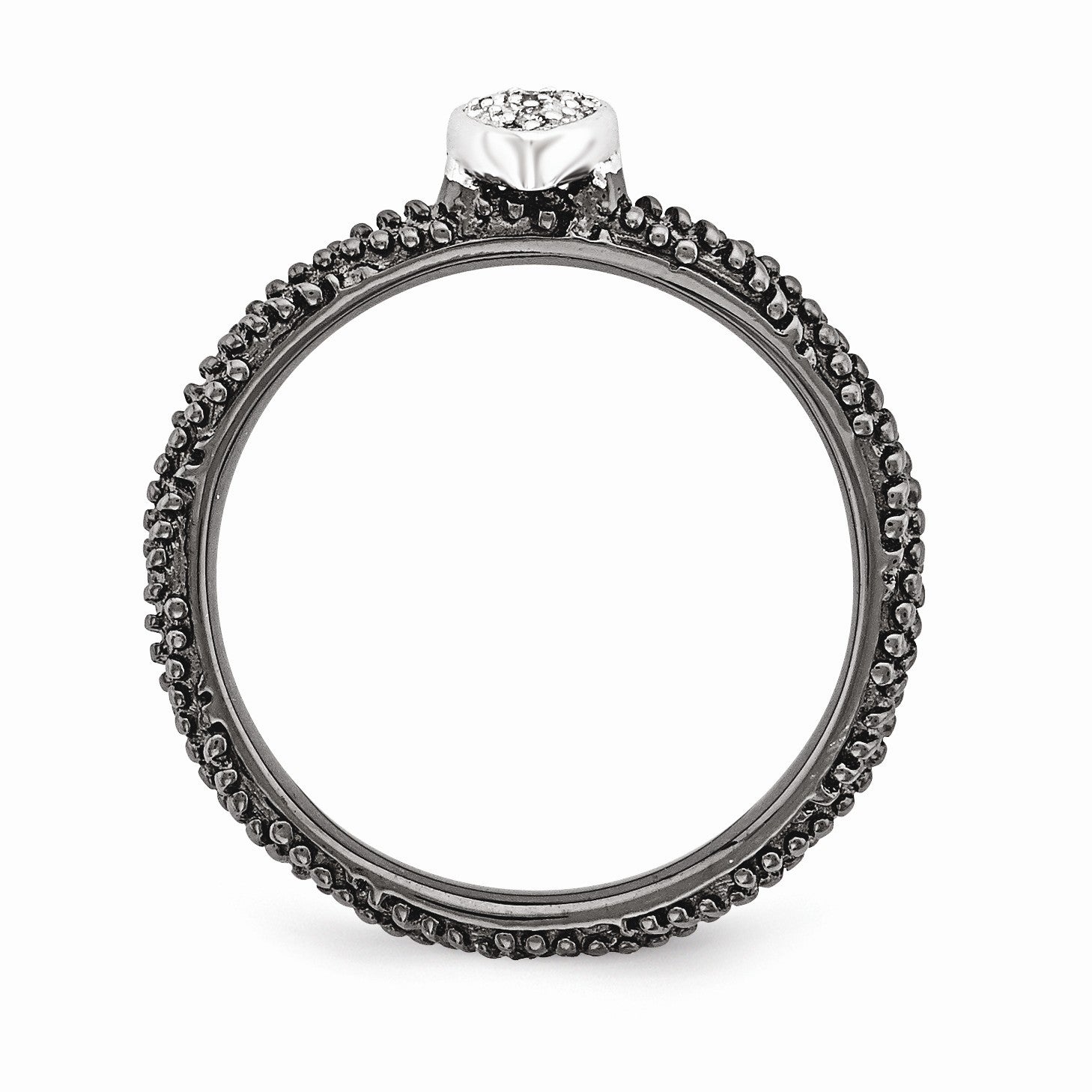 • Create a look that is all your own with a fun assortment of rings that looks great alone or stacked in a collection to express your own unique style. This polished textured ring fashioned from black ruthenium plated sterling silver features a 5mm heart pave set with four genuine diamonds and a 2.5mm width milgrain band. The natural white diamonds are H-I in color, I3 clarity and the total diamond weight is 0.2 carat. Guaranteed to fit together perfectly with all of the mix and match Stackable Expressions rings.