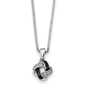 Opposites do attract! Like the sparkle of the stars in the dark night sky, this black and white diamond knot necklace matches that beauty. It is designed from tarnish resistant rhodium plated sterling silver and prong set with H-I natural white and black heat-treated, I2-I3 clarity diamonds totaling 0.15 carat. The small pendant is approximately 10mm (3/8 inch) in width by 17mm (5/8 inch) in length, which includes the bail. The 1mm box chain is finished with a spring-ring clasp and 2-inch extension that makes it adjustable from 18 to 20 inches in length.