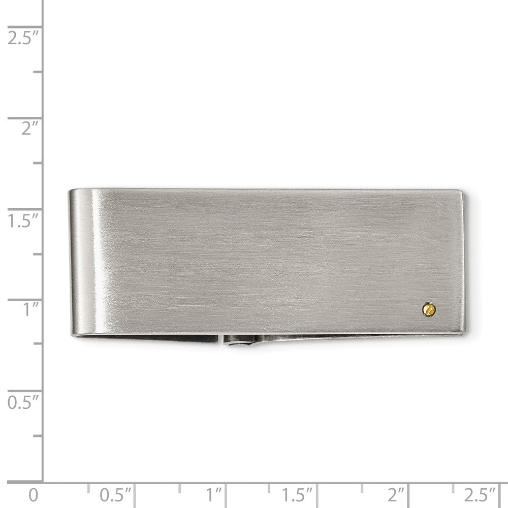 This men's hinged money clip crafted with brushed stainless steel features a 14 karat gold plated screw accent. It is approximately 20 x 52mm in size and suitable for engraving.