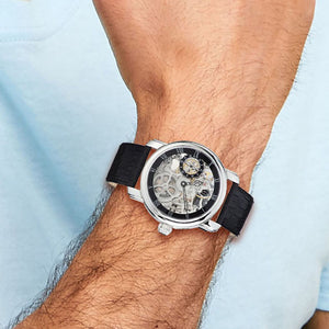 Charles Hubert Mens Leather Band Black Skeleton Dial Watch - Black Bow Jewelry Company