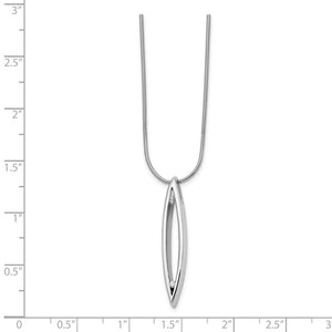 A simplistic design with timeless style featuring a diamond accented marquise pendant on an adjustable 1mm snake chain fashioned from tarnish resistant rhodium plated sterling silver. The pendant is approximately 32mm (1 1/4 inch) in length by 6mm (1/4 inch) in width. The snake chain is finished with a lobster clasp and 2-inch extension that allows you to change the length from 18 to 20 inches. The natural .02 carat diamond is I2 in clarity and H-I in color.