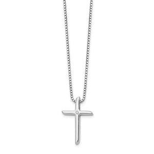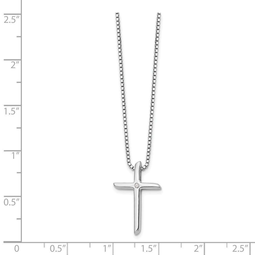A simplistic design with timeless style featuring a diamond accented cross pendant on an adjustable 1mm box chain fashioned from tarnish resistant rhodium plated sterling silver. The polished pendant is approximately 20mm (3/4 inch) in length by 13.5mm (1/2 inch) in width. The box chain is finished with a spring ring clasp and 2-inch extension that allows you to change the length from 18 to 20 inches. The natural .01 carat diamond is I2 in clarity and H-I in color. This item is backordered. Please allow 7-10 business days for delivery