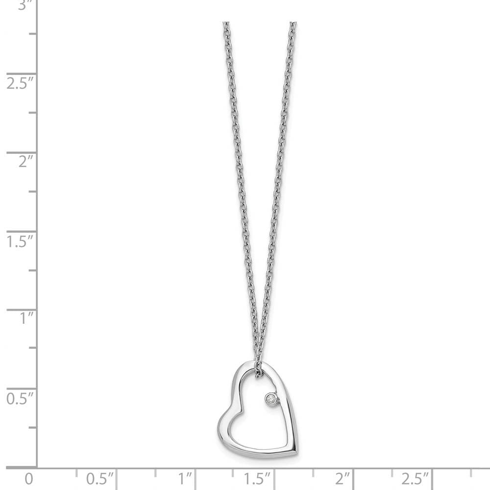 A timeless classic design featuring an adjustable length necklace made from tarnish resistant, rhodium plated sterling silver accented with a single white diamond. The asymmetrical heart pendant is approximately 17mm (5/8 inch) in width by 20mm (3/4 inch) in length. It comes ready to wear on 1mm width, 18 inch long cable chain finished with a lobster clasp and 2-inch extension for flexibility. The natural .01-carat diamond is I2 in clarity and H-I in color.