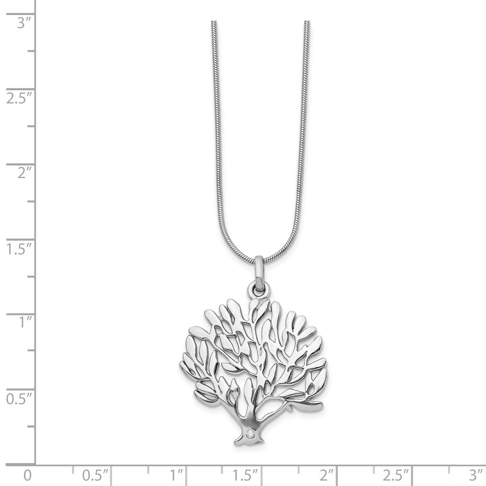 A timeless classic design featuring a diamond accented tree pendant with an adjustable chain made from tarnish resistant, rhodium plated sterling silver. The polished pendant is approximately 29mm (1 1/8 inch) in width by 30mm (1 3/16 inch) in length. The 1mm snake chain is finished with a lobster clasp and 2-inch extension that allows you to change the length from 18 to 20 inches. The .01-carat natural diamond is I2 in clarity and H-I in color.