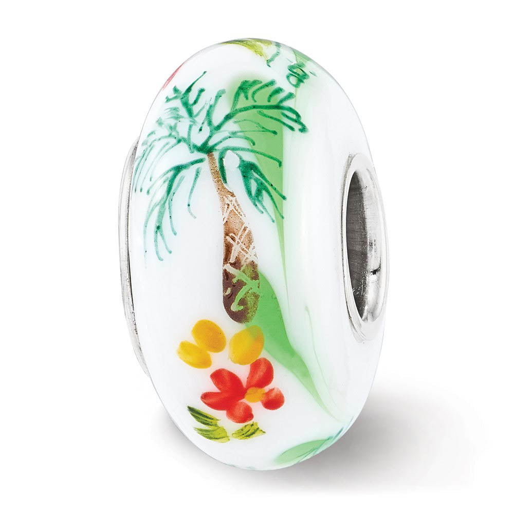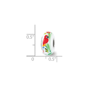 Each meticulously hand-blown hand-painted Fenton glass charm is initialed by the artist and finished with a ceramic glaze and a sterling silver core embossed with Fenton USA! This white charm features a parrot and palm tree design that is approximately 8mm in width by 15mm in length. Fenton Made in America handcrafted glass beads are compatible with and will fit most major brand, 3mm width, bead style bracelets and necklaces. Colors and size may vary slightly.