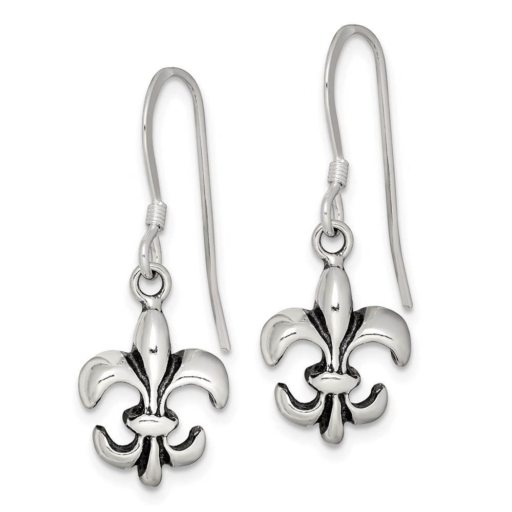 Add a touch of royal glamour to your style with these fleur-de-lis earrings fashioned from polished and antiqued sterling silver. They are approximately 11mm (7/16 inch) in width by 30mm (1 1/8 inch) in length, which includes the ear wire.