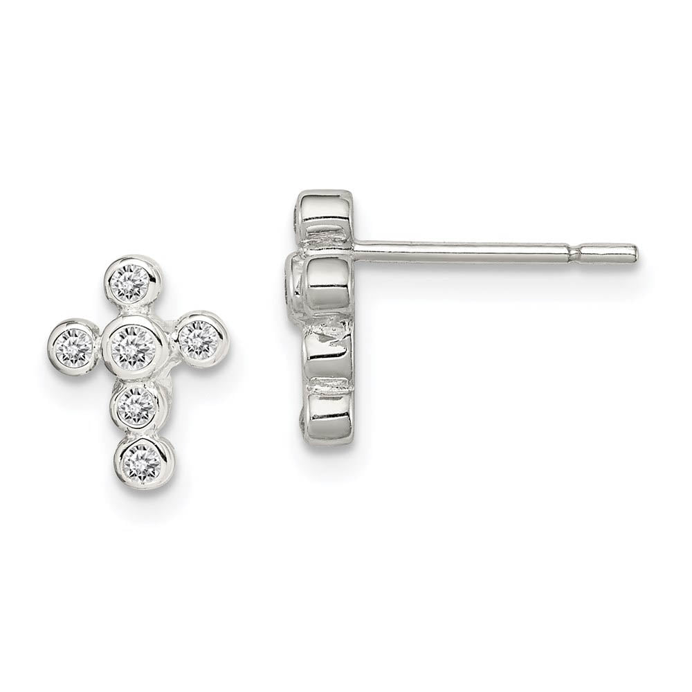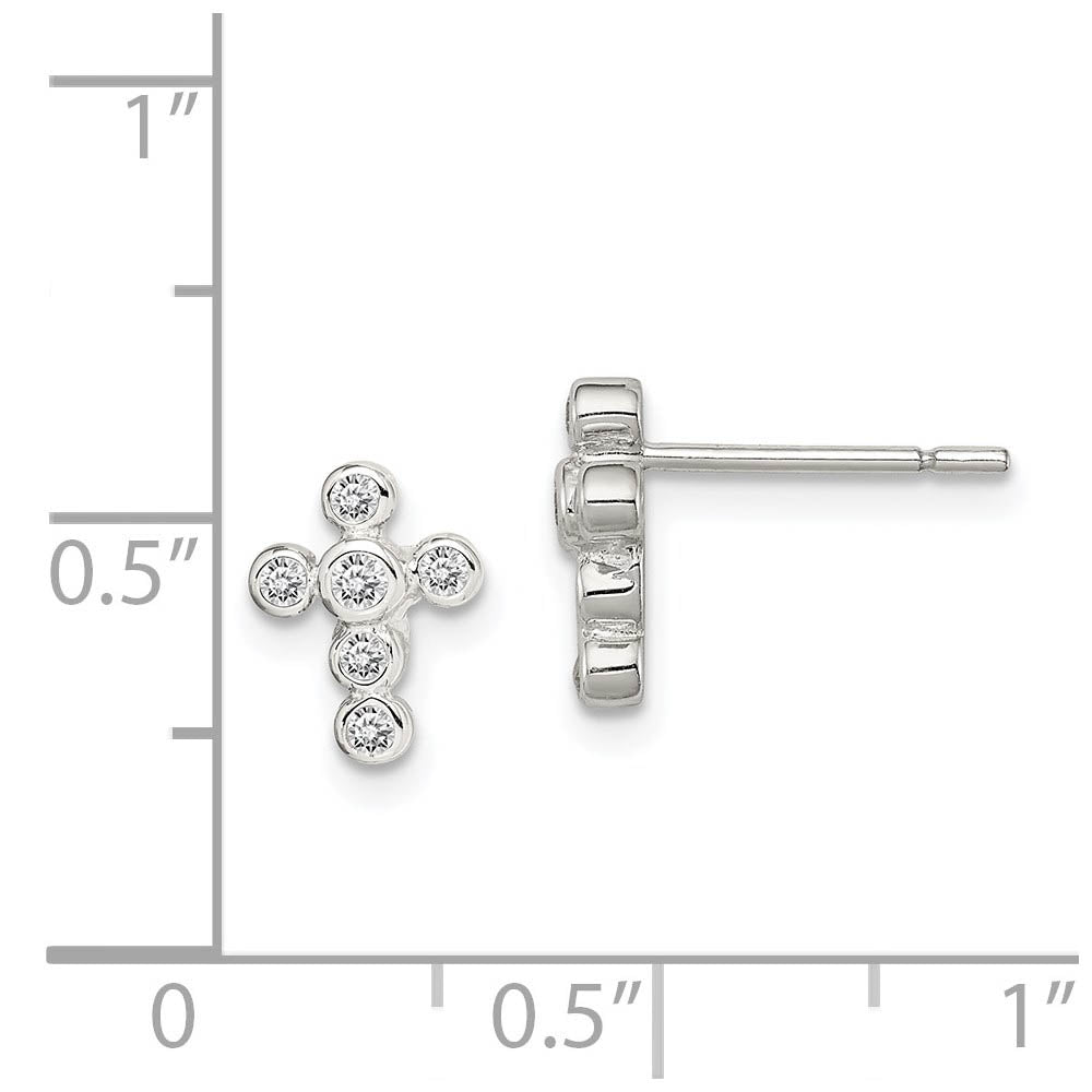 Let your faith shine with a jeweled cross fashioned from rhodium-plated sterling silver and bezel set cubic zirconia gemstones. These friction-back post earrings are approximately 7mm (1/4 inch) in width by 9mm (3/8 inch) in length.