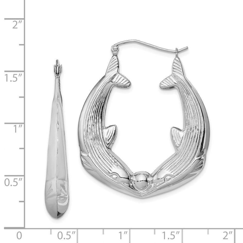 Flaunt your fun loving style with these kissing dolphin hoops made of rhodium plated sterling silver! They measure approximately 40mm (1-1/2 inches) in length by 34mm (1-3/8 inches) in width and feature a bright, polished finish with a hinged post back.