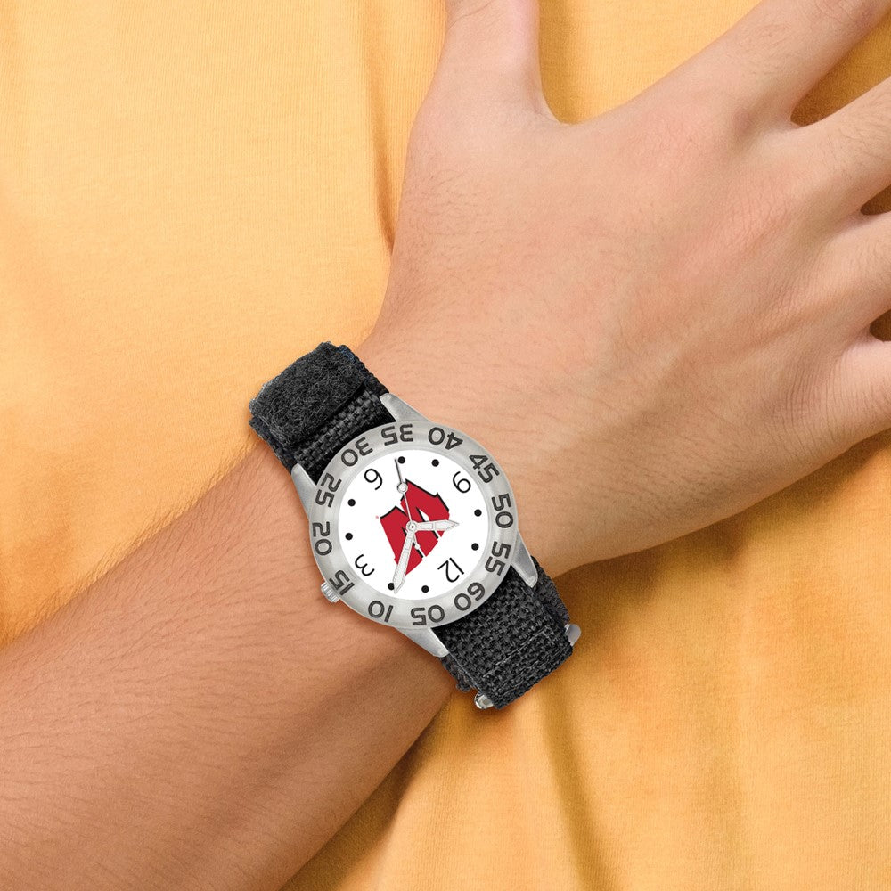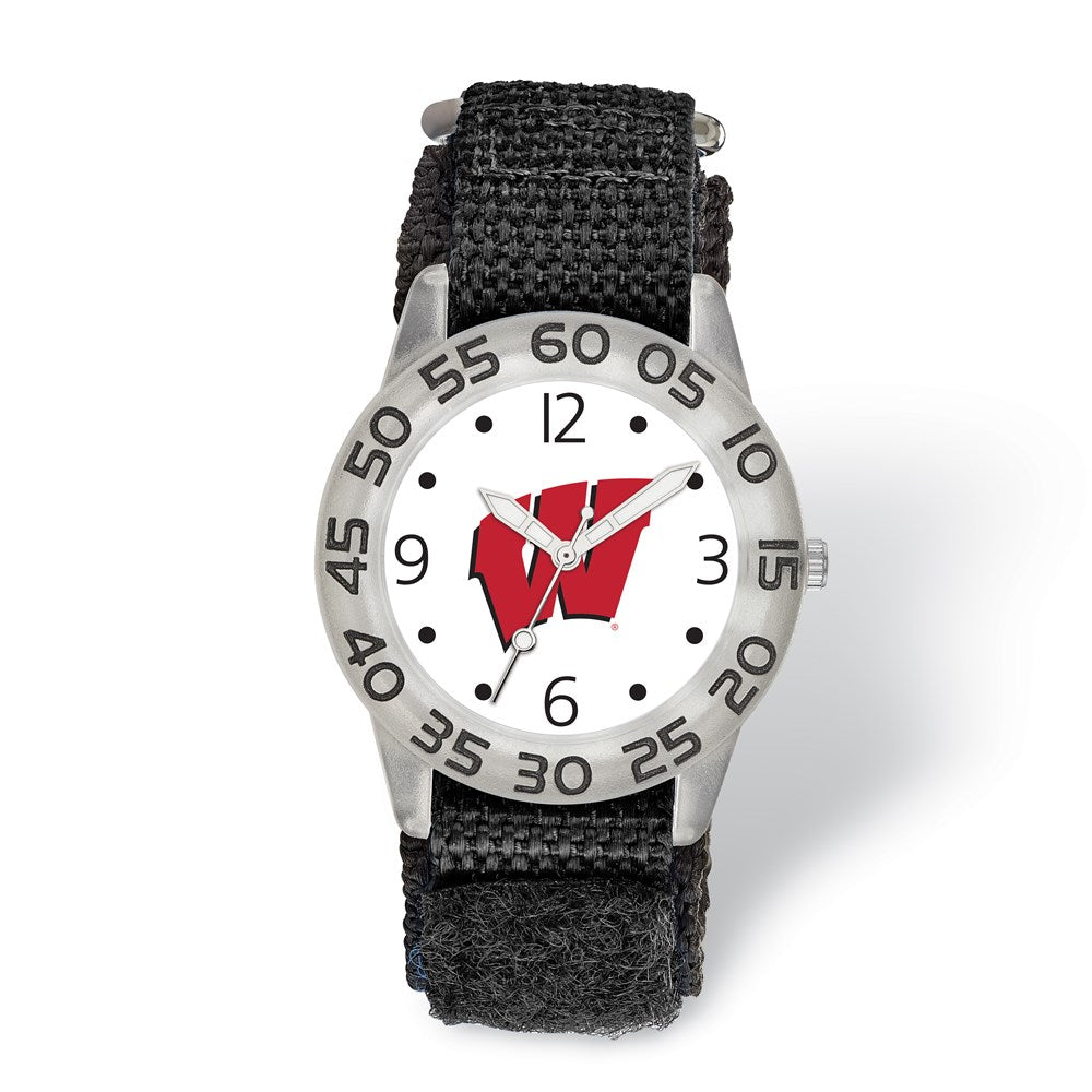 Category: 2 Year Warranty 3 ATM (Tested) Water Resistant Alloy Analog Display Black Colored Band Boys Watches Collegiate Girls Watches Hook and Loop Closure Kids Watches Mineral Crystal NCAA NCAA - U. of Wisconsin Not Engravable Nylon Band Quartz (Battery Operated) Round Face Stationary Bezel White Face Wrist Watch