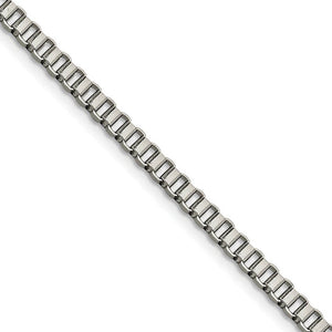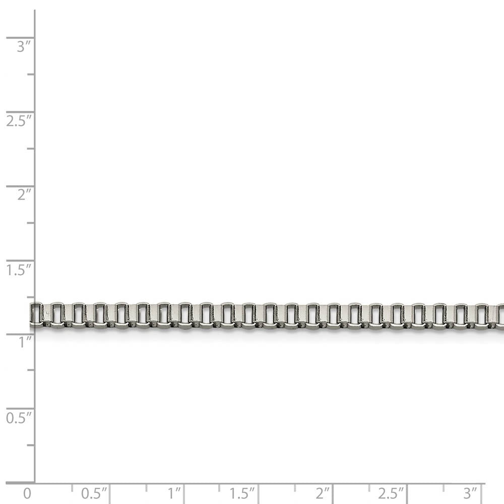 • Known for its strength and flexibility, this gleaming box chain features a simple design that is less likely to kink and a polished finish that catches the light with every movement. It measures 4mm in width, 24 inches in length and is fashioned from 316L stainless steel, a contemporary metal that will not rust or tarnish.