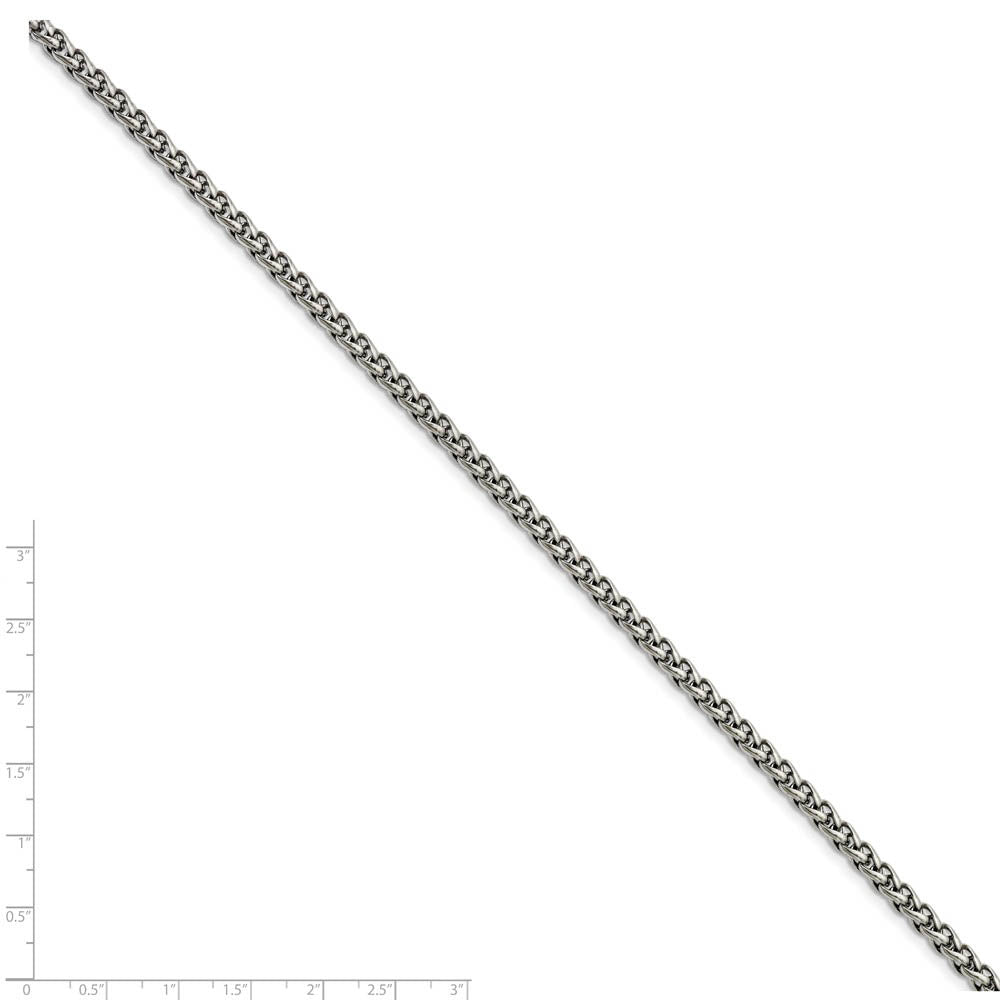 A seductive chain intricately woven from inert stainless steel features a polished braided wheat pattern with a smooth round design. It measures 5mm in width, 24 inches in length and closes with a fancy lobster clasp.
