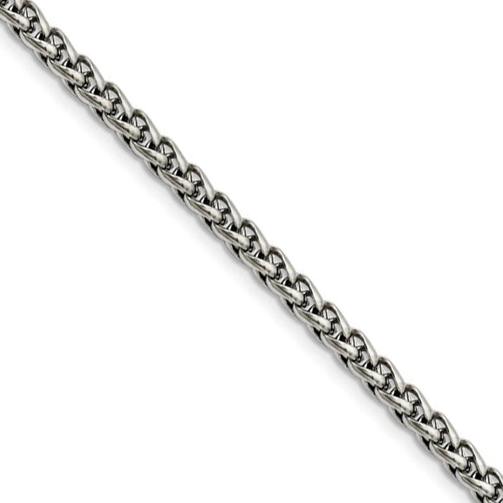 A seductive chain intricately woven from inert stainless steel features a polished braided wheat pattern with a smooth round design. It measures 5mm in width, 20 inches in length and closes with a fancy lobster clasp.