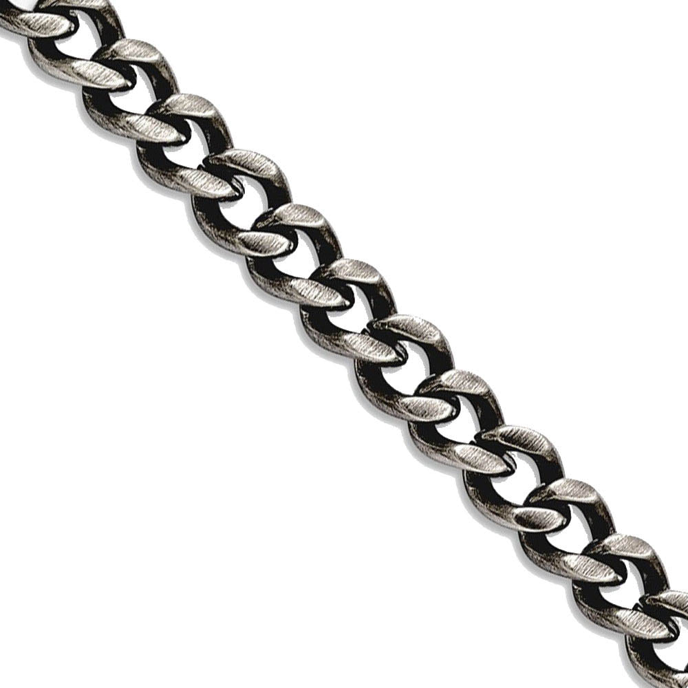 Curving geometric lines combined with the polished oxidized tone as well as the inertness of stainless steel make this 20-inch necklace chain an excellent choice for everyday wear. The heavy curb links measure 6.7mm in width and close with a fancy lobster clasp.