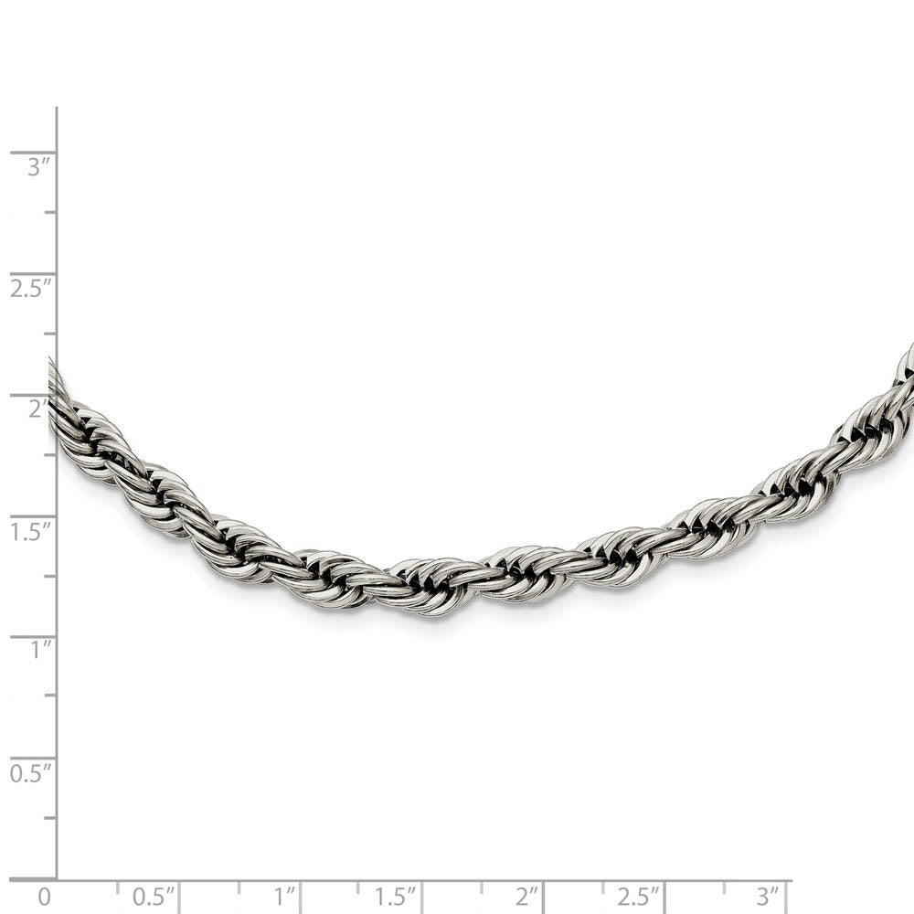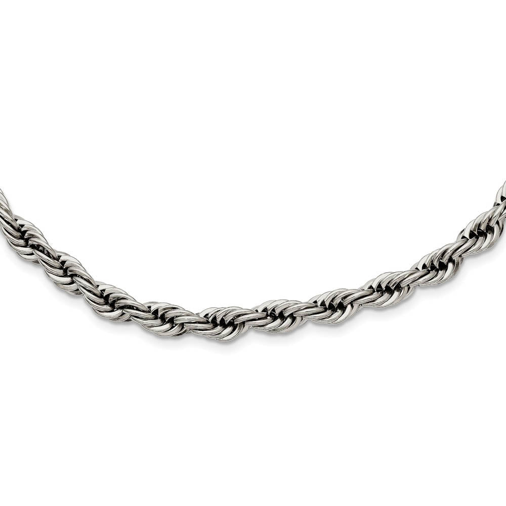 A classic rope chain features two thick strands woven together in a spiral design that offers strength, integrity and elegance all in one. This one is fashioned from polished stainless steel, a contemporary metal that is durableand tarnish proof.. It is measures 6mm in width by 20-inches in length, which provides versatility for both men and women.