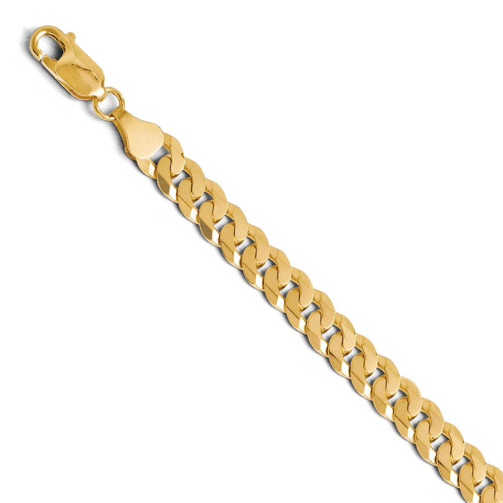 Flat curb links of 14k yellow gold enhanced with beveled edges form an attractive bracelet that looks great alone or layered with multiple chains. This one features solid links that measures 6.75mm in width by 9 inches in length, which includes the lobster claw clasp.