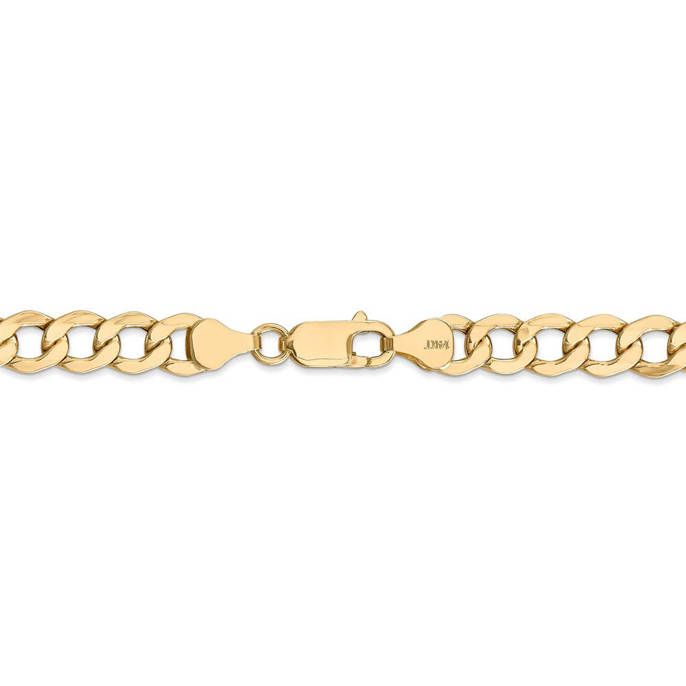 • Clean, geometric lines and the lustrous glow of our 14k yellow gold curb chain make this an excellent choice for casual or evening wear. This one features lightweight hollow links that are 7mm in width by 8-inches in length and closes with a lobster-claw clasp.