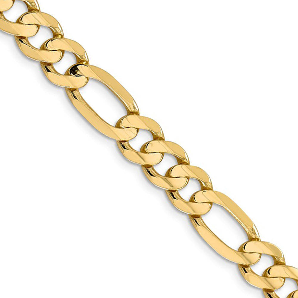 Our 14k yellow gold, open figaro chain closes with a lobster-claw clasp and features a modern concave design that has been hand-polished to ensure a smooth finish. Measuring 8.75mm in width, the solid link construction of this beautiful chain offers versatility along with durability. 22 inches in length.