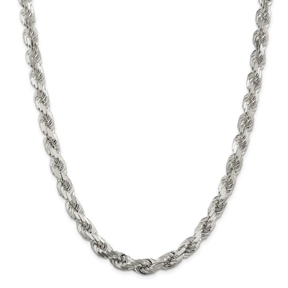 • Spiraling rope chains made of sterling enhanced with diamond-cuts are extremely popular because they offer a classic design with maximum shine. Flexible and strong, this wide 8mm solid link 26-inch necklace chain features eight sides and closes with a lobster-claw clasp. Made in Italy.