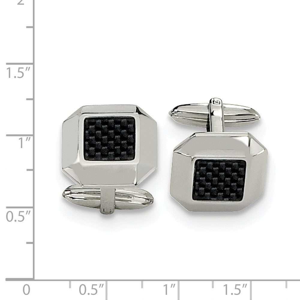 These men's cuff links are crafted from stainless steel and have a polished finish. They also feature black carbon fiber accents. Approximate size 17 x 17mm.