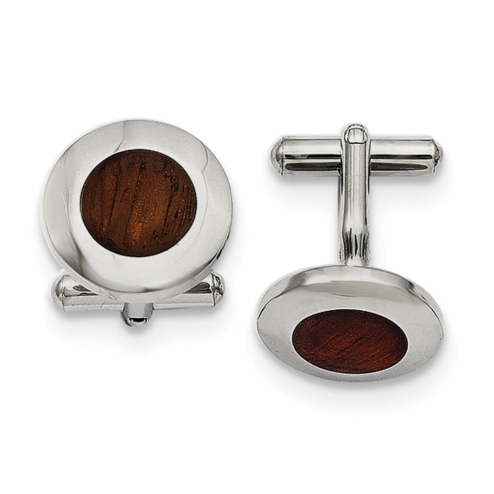 Earthy masculine style featuring a polished stainless steel round design with a wood inlay center and a bullet back closure. These contemporary cuff links are approximately 15mm (9/16 inch) in diameter.