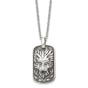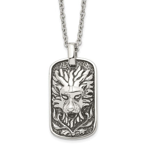Daring, mesmerizing, eclectic style! This polished and antiqued stainless steel necklace features an embossed lion's head dog tag pendant that is approximately 25mm (1 inch) in width by 51mm (2 inches) in length, which includes the bail. It hangs on a 2.5mm width, 22-inch long polished cable chain that closes with a fancy lobster clasp. Suitable for engraving on the back.