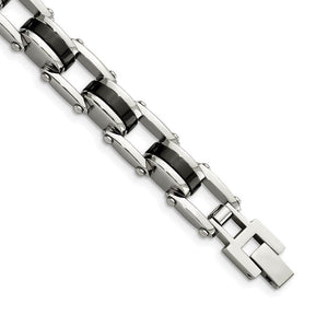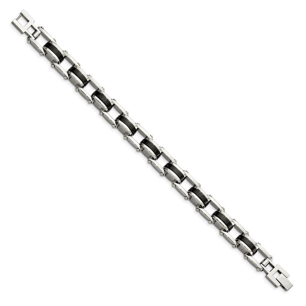 Crafted with 316L stainless steel, a metal designed to look new even through long and steady use. Has a polished finish and includes a fold over locking clasp. This bracelet also features black plated accent links that are created with an advanced process that fuses color to the metal to ensure hardness and lasting durability. 8.5 inches in length. 10 mm in width.
