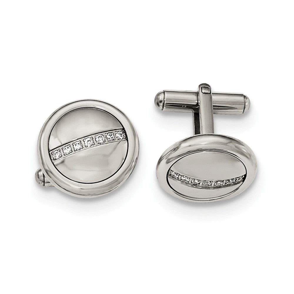 Take your image and style up a notch with these polished stainless steel cuff links featuring a center stripe prong set with seven cubic zirconia gems and a bullet backing. The round top measures approximately 18mm (11/16 inch) in diameter.