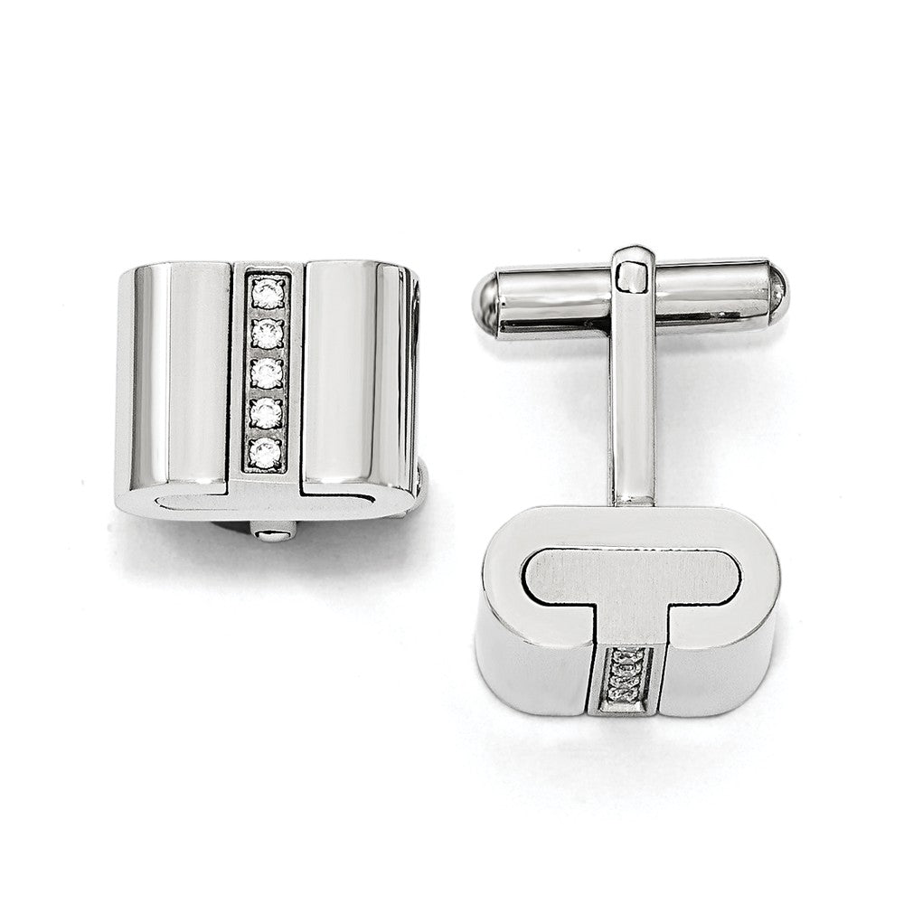 Take your image and style up a notch with these polished and brushed stainless steel cuff links featuring a center stripe prong set with five cubic zirconia gems and a bullet backing. The square top measures approximately 16mm (11/16 inch) in width by 16mm (11/16 inch) in length.