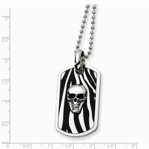 This stainless steel necklace features enameled zebra stripes with an embossed skull and a 24 inch beaded chain finished with a fancy lobster clasp. The polished pendant measures 2 inch x 1 inch including the bail.